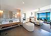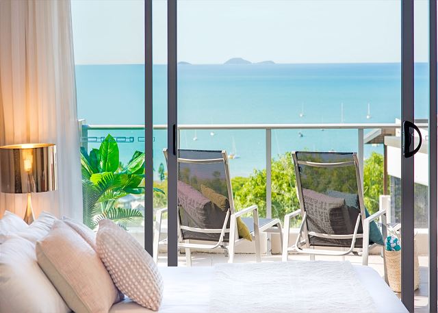 The beautiful king-sized bedroom suite has its own television and a continuation of those Coral Sea views.