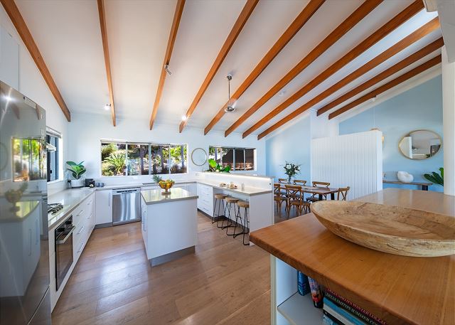 The open plan gourmet kitchen is the heart of the home and comes complete with gas stovetop, electric oven, coffee machine, microwave, dishwasher and large refrigerator. Enjoy your morning coffee as you sit out on one of the 3 outdoor areas & take in the amazing water views.