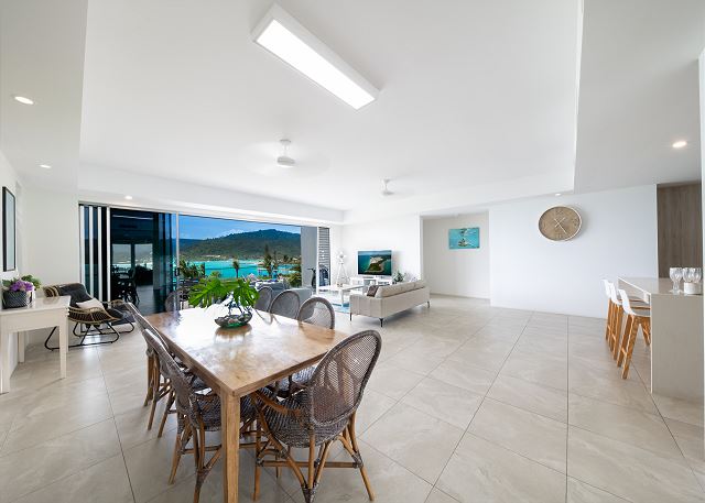 Recently completed imposing and distinctive 1 bedroom apartment sited on the beachfront right in town, yet in an undisturbed quiet locality overlooking a mighty Airlie Bay seascape across to Hayman Island and beyond to the horizon.