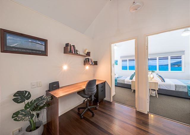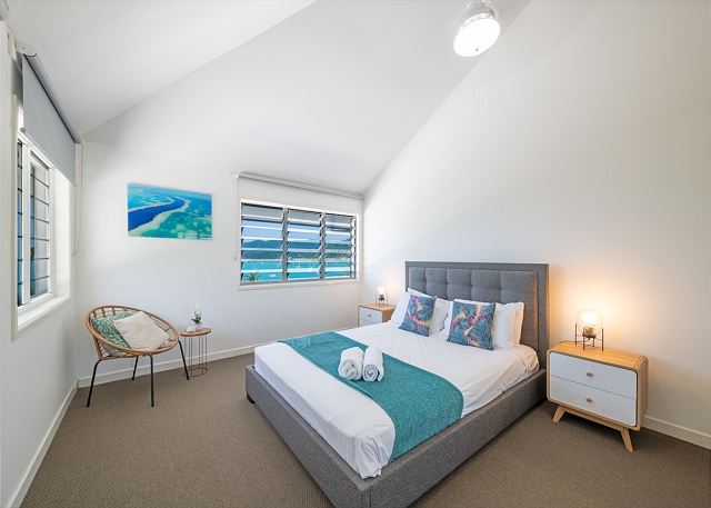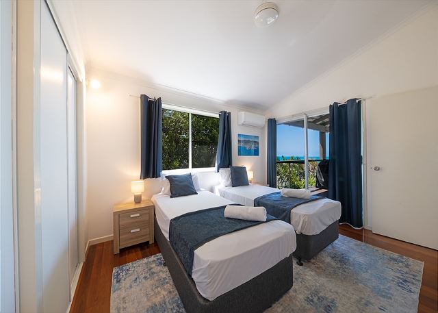 Second Floor - As soon as you make your way down the timber staircase this is where you get to see the stand-out feature of this property, Its Views!! This light-filled and clean white space emanates beach-style living which is just what you want to help you shut off from the world and have a relaxing stay. Towards the left of the dining area is the third bedroom with 2 single beds this bedroom also has access on to the large wrap-a-round balcony. The well-equipped kitchen features an oven/cooktop, dishwasher, coffee machine and plenty of storage and bench space. Just perfect for large family meals. The lounge area seamlessly integrates with the dining area and all the furniture is designed with comfort in mind. Large glass doorways lead out onto a massive balcony with stunning views over Airlie Beach and the Whitsunday Islands beyond. This is a fantastic area to enjoy a BBQ with alfresco dining and drinks with great company. This level also has a second bathroom and a fully equipped laundry.