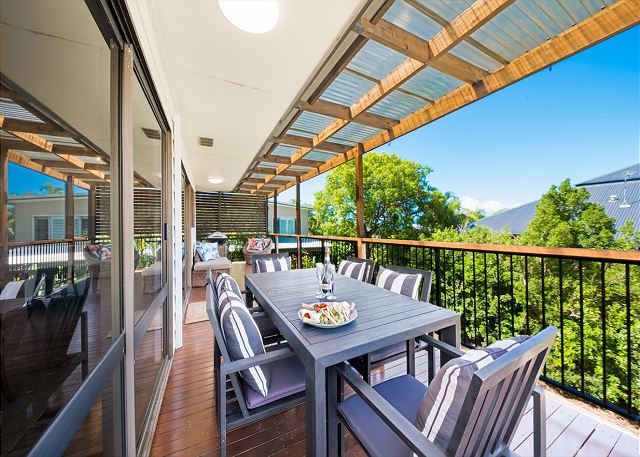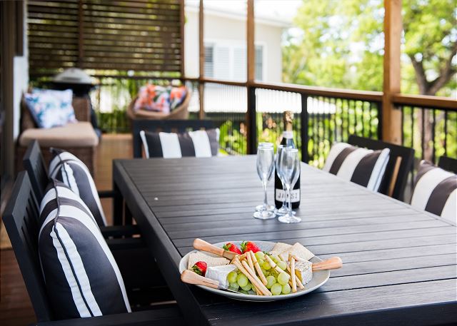 From the living area, step outside to the covered deck area and enjoy pre dinner drinks and a BBQ with family and friends.