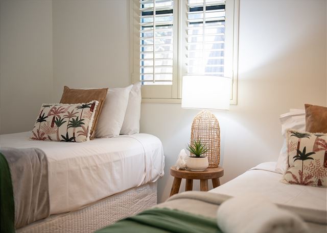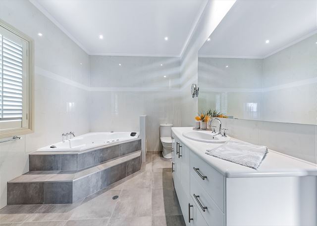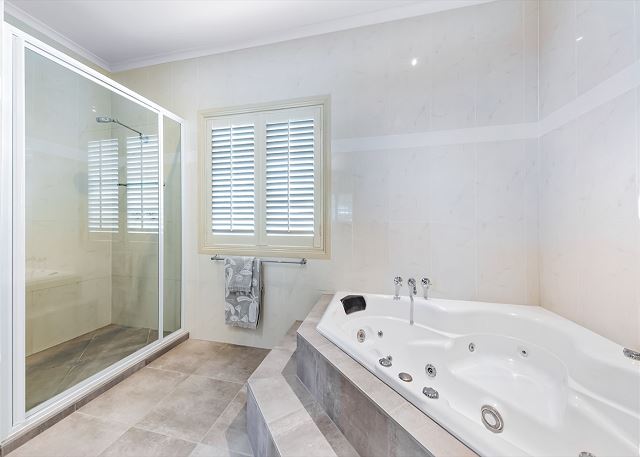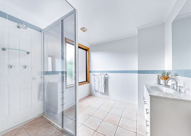 All the bedrooms are spacious and inviting. With ocean views from a private balcony, the main bedroom features a huge walk-in robe, a small study nook and an ensuite with a spa. Two of the guest bedrooms have built-in robes, one has its own bathroom and another has a private balcony. The main bathroom is housed on the second level while a combined bathroom/laundry is located upstairs.