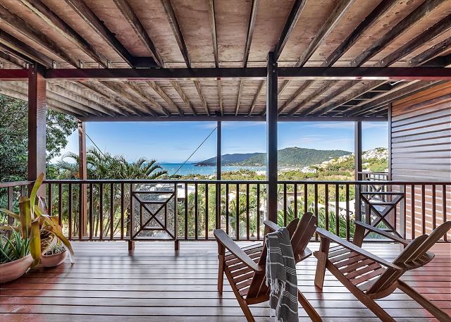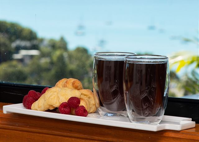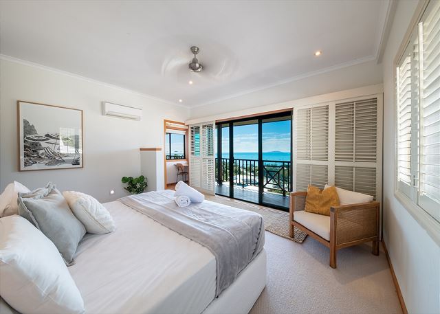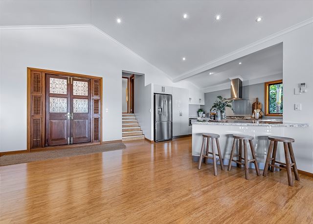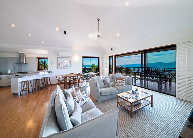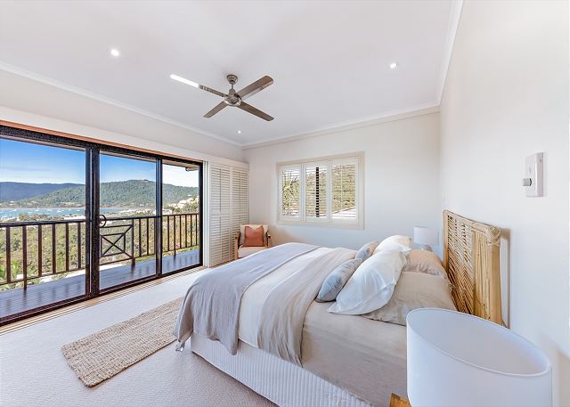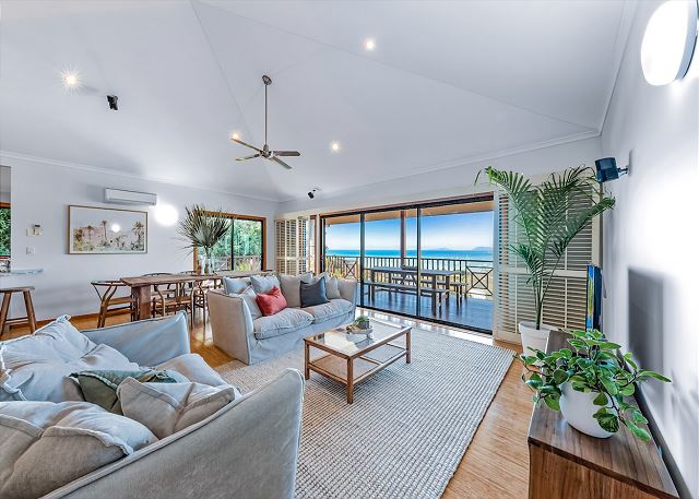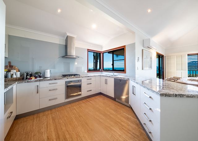 There are four large bedrooms, three impeccable bathrooms and two light-filled living areas where you can spread out and relax. The commanding water views are on show from almost every room in the house including in the kitchen. This holiday home features sweeping Caesarstone benchtops, a gas cooktop, an electric oven and high-end fixtures