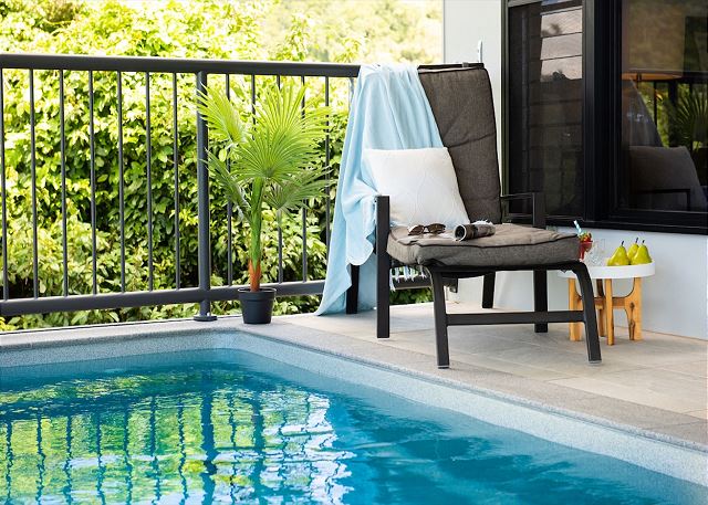 For guests who love to cook, premium Beko appliances are all yours in the kitchen along with Kalahari granite and dark cabinetry and bench tops, eye-catching wall tiles and floor-to-ceiling cabinets. Natural light flows through from the wall of windows & doors in the combined dining, kitchen and lounge area. Ocean and mountain views are carefully framed as you step out on to 1 of 2 large decks. Your top deck offers an outdoor kitchen with lounge and dining seating. Your bottom deck opens on to your own private swimming pool which is heated to a lovely 28 degrees year-round.