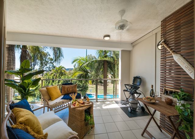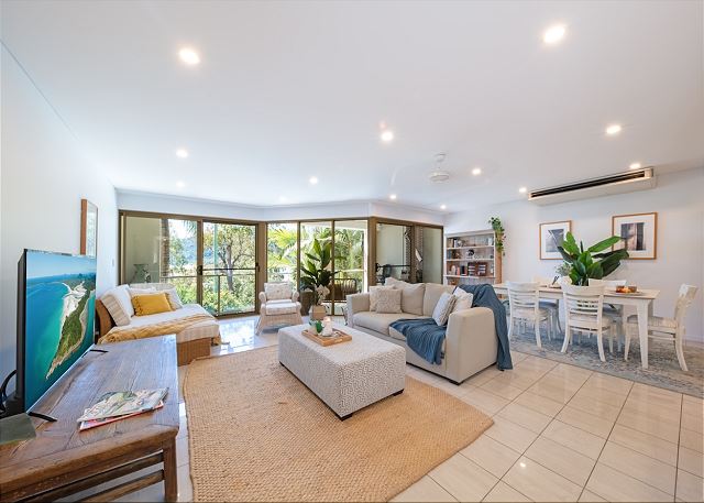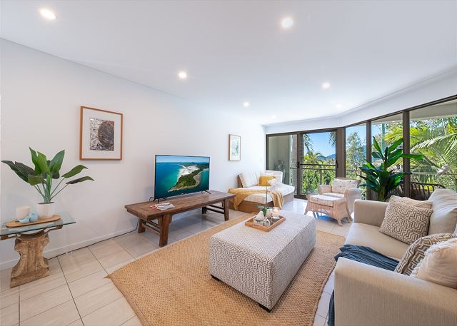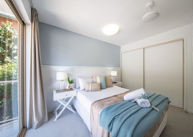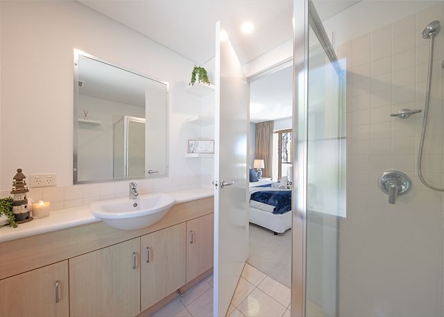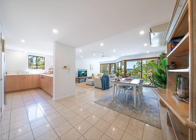 This generous sized apartment features a spacious open plan living and dining area with a tiled outdoor veranda overlooking the sparkling pool and spa with the ocean views as your backdrop. The fresh, coastal inspired furniture and styling create a sense of elegance, calmness and relaxation.