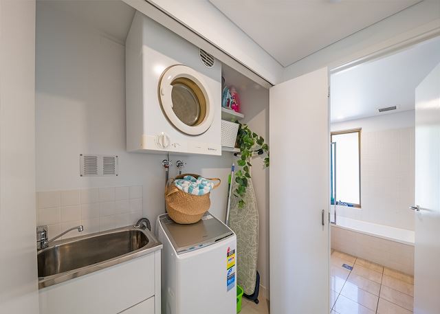 There is a large king sized master bedroom with ensuite and built in robe, second bedroom with a queen bed, main bathroom access which includes a bath. The apartment is also fully airconditioned throughout including bedrooms. A separate laundry with washing machine and dryer is tucked away for convenience.