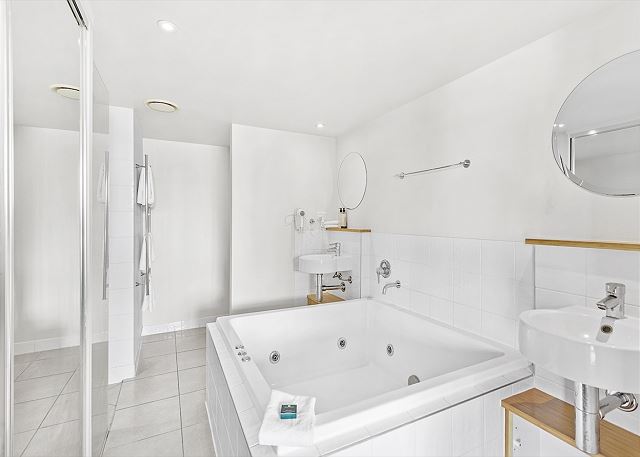 , jetted tub, queen, shower, twin/ single, Smart TV, Air Conditioning, Hair Dryer, Linens Provided, Wifi, Free Wifi, Coffee Maker, Dishwasher, fitness center, Ocean View, Balcony, Communal Pool, Smoke detectors, Fire extinguisher