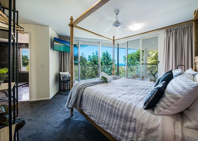 Downstairs, you'll discover three inviting bedrooms, each thoughtfully furnished for a restful night's sleep. The master bedroom boasts a comfortable fourposter queen-sized bed and an ensuite bathroom, with a balcony off, providing a private oasis for relaxation. The two additional bedrooms are equally well-appointed, with a queen bed in one and and single futon in the other. There is also a laundry with a washer/dryer and an additional bathroom on this level. The fourth bedroom is off the main living area with a queen futon and offers one of the best sea views
