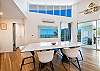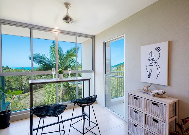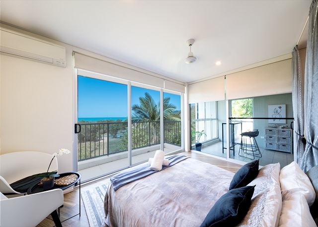 Upon entering the townhouse, upstairs you'll find a tastefully decorated and spacious living area, designed with comfort and relaxation in mind. The open-plan is enhanced by the design of high windows allowing the sun light to fill the home and to embrace the beautiful coral sea views creating a bright and airy atmosphere. The layout seamlessly connects the living room to the dining area and fully-equipped kitchen. Stylish and comfortable furnishings provide a cosy retreat after a day of exploring the wonders of Airlie Beach.