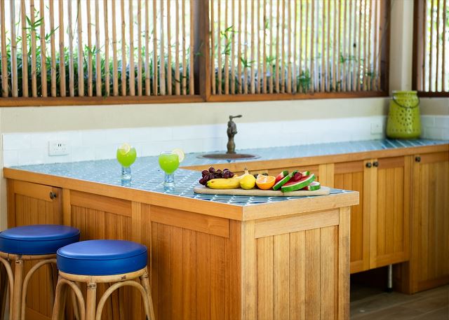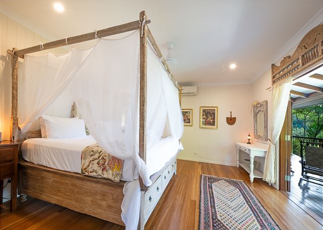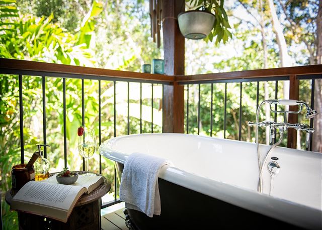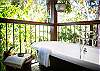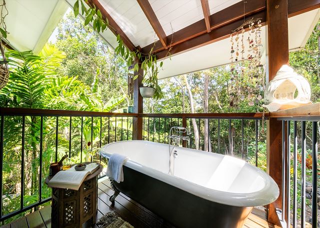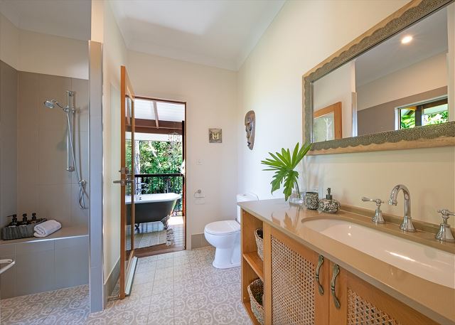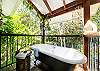 Each of the 2 bedrooms features its own bathroom, with the master suite showcasing a four-poster bed, an ensuite, and an outdoor clawfoot bath overlooking the tropical gardens. It’s a one-of-a-kind experience, inviting you to bathe in beauty like nowhere else.