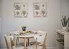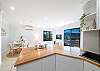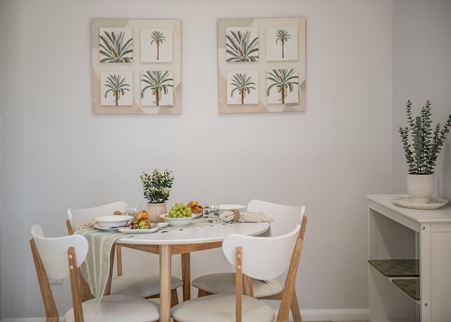 The open-plan living area is light and inviting, with a comfortable lounge, smart TV, and dining space for two. A well-equipped kitchen offers everything you need for cooking up a meal, including an oven, cooktop, microwave, fridge, and tea/coffee facilities.