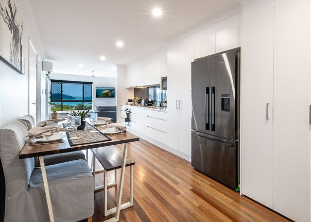 king, shower, sleep sofa /futon, toilet, Smart TV, Air Conditioning, Clothes Dryer, Garage, Hair Dryer, Iron & Board, Linens Provided, Living Room, Parking, Towels Provided, Washing Machine, Wifi, Free Wifi, Coffee Maker, Dishes & Utensils, Dishwasher, Kitchen, Microwave, Oven, Refrigerator, Stove, Toaster, Dining Table, Ocean View, Water View, Balcony, Private entrance, Dining Area, Smoke detectors, Fire extinguisher